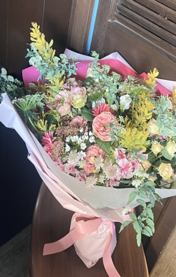 大きな花束を作るには、それなりにしっかりした茎のものを使わないときれいな仕上がりにはならないので、やっぱり高額なお品になりますね。