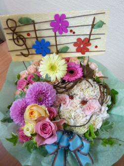 お客様のリクエストは「お花でスマイルできますか?」でした。んん?と一瞬考えたワタシに、「お花でお顔ができますか?」と分かりやすく言い変えてくださいました。明日初日のミュージカル、【サウンド・オブ・ミュージック】の子役の女の子に贈られるアレンジメントです。